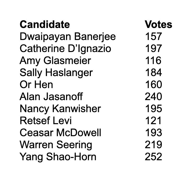 Candidate statements and a description of the election process were posted on the FNL website. The statements were also distributed with the call to vote from Faculty Chair Roger Levy. As in previous elections, MIT Institutional Research administered the ballot and tallied the results.