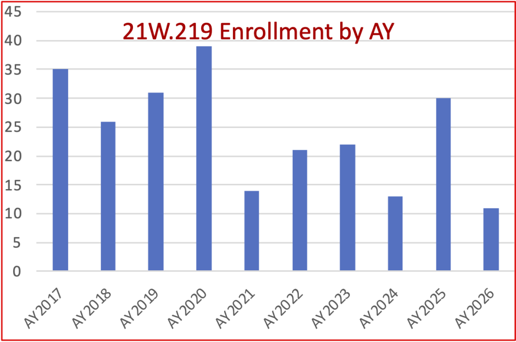 Now, though, two years later, writing enrollments have dropped again, and even further. This despite continued high subject evaluations (averaging above 6.7/7.0), and despite steady numbers of recommendations based on the EET. For example, for 21W.219, “Foundations of Academic and Professional Writing,” the high-intermediate foundational class designed for first-year students who show significant gaps in the writing skills they need upon arrival at MIT: