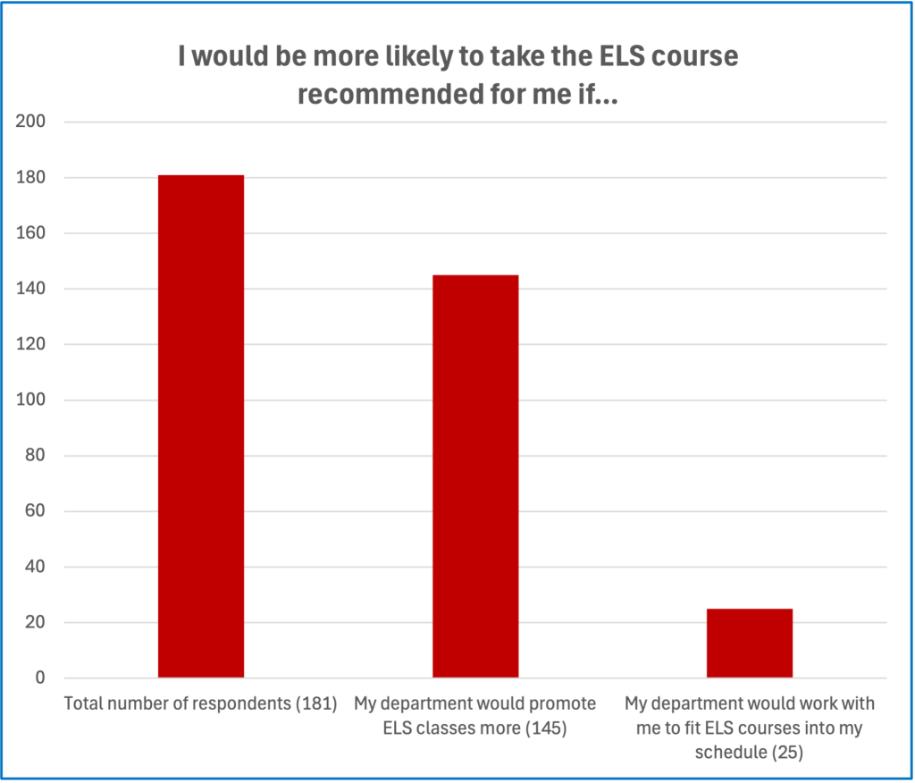 One response to our 2023 graduate survey that I neglected to mention in my 2024 piece was that from students who had been recommended for an ELS course but hadn’t taken one yet: What would make it more likely that they would?, we asked. Over 80% of NNESs taking the survey responded, “If my department would promote ELS classes more.”