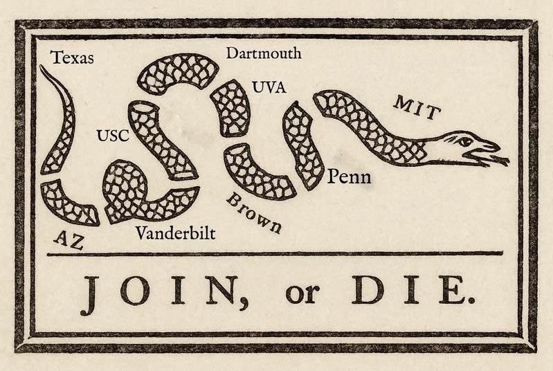 In this brilliant adaptation of a 1754 political cartoon and woodcut by Ben Franklin, the University of Pennsylvania historian Benjamin Nathans reimagines the problem of collective action for our own time.  You can find the original cartoon and its story here.  Suffice to say that Franklin’s cartoon was conceived at the time of the Albany Congress, the precursor to the Continental Congress, to encourage the British American colonies to unite in opposition to French forces and their Native American allies on the eve of what would become the Seven Years War (1754-1763).  The original depicts the four New England colonies as a single section of the snake; Georgia and Delaware are missing.  The cartoon was subsequently used to mobilize colonial opposition to the British empire and is one of the most iconic images of the American revolutionary era.  As we approach the 250th anniversary of American independence, the Nathans adaptation of Franklin is a reminder of the indispensable role that history and collective action can and must play in meeting the challenge of this moment.